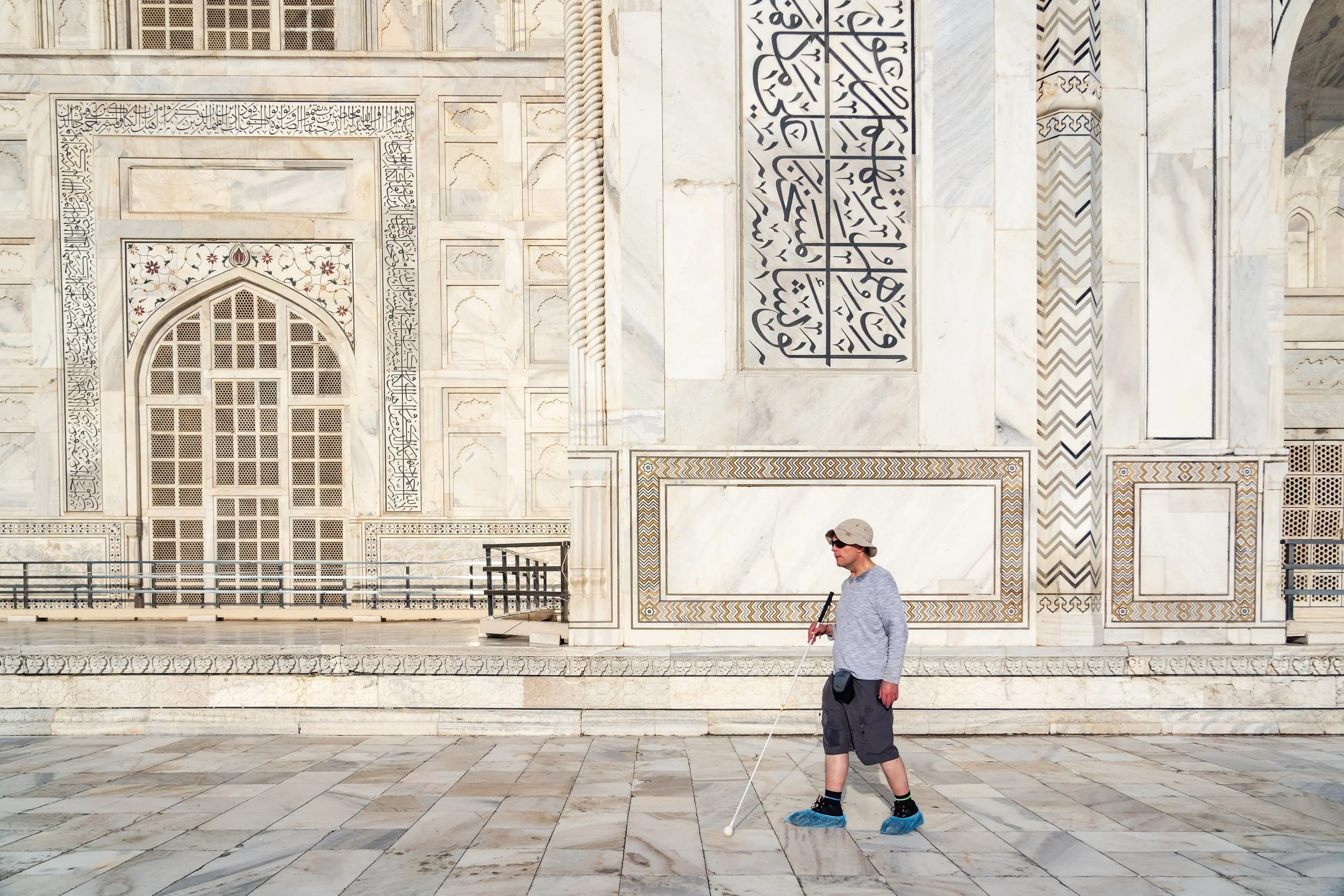 Luke walked beside me, one hand curled around my arm, the other tapping a gentle rhythm with his white cane. We were crossing the Taj Mahal’s grounds just after sunrise, the air already balmy and faintly perfumed. From the scattered murmur of tourists, Luke said he could sense a grand, open space around us. I described the Persian-style gardens — reflecting pools, clipped shrubs, stone walkways in perfect symmetry. Then I read aloud a sign: “Don’t make direct eye contact with monkeys.”