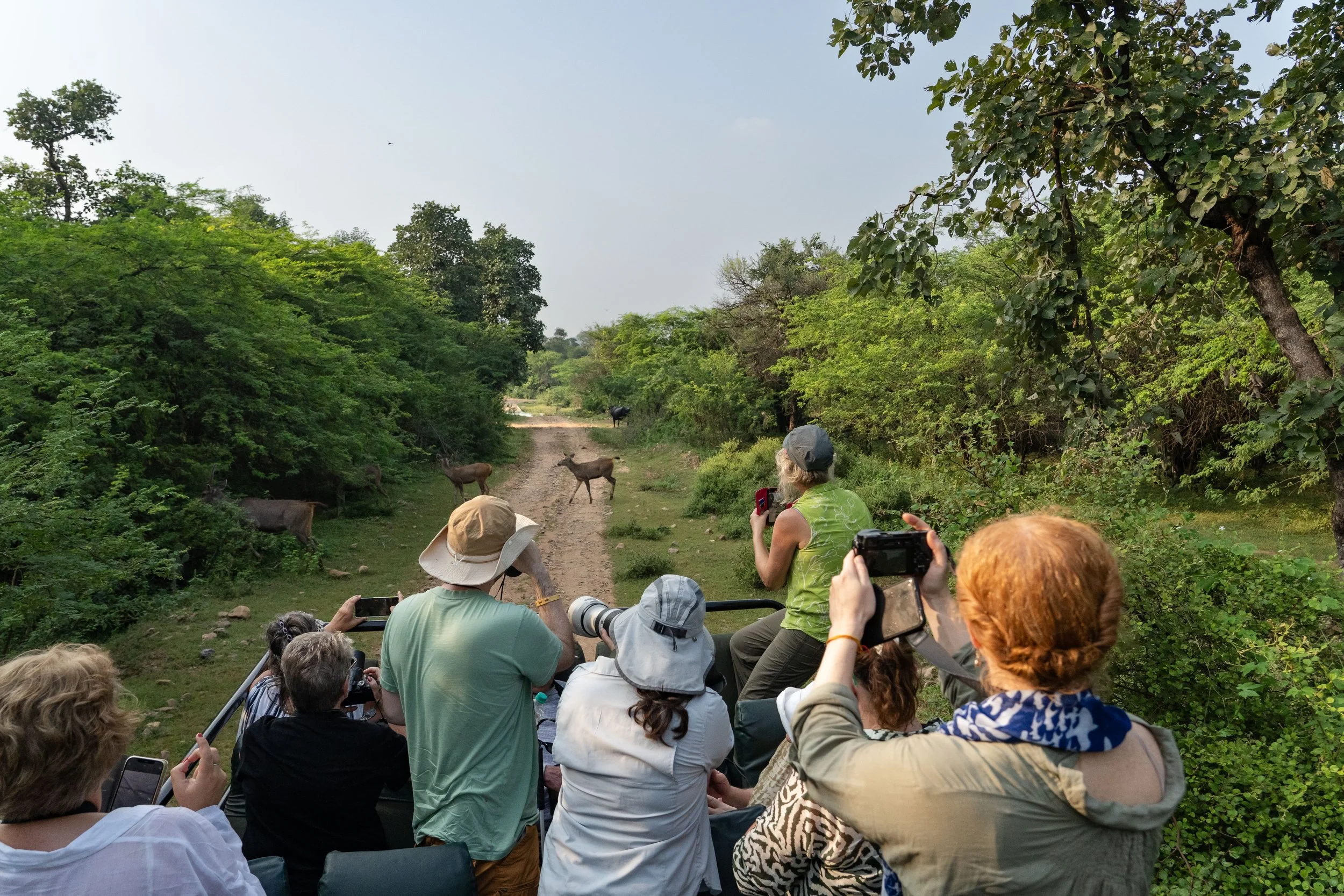 We toured the park in an open-topped bus, its diesel engine rattling as we bounced along rutted dirt tracks that wound through dry forest, open meadows and rocky outcroppings. Every so often, our driver stopped at the sight of antelope, sambar deer or a quick-moving mongoose. Channeling David Attenborough, I narrated for Candie as a peacock fanned his feathers in a slow, deliberate courtship display.